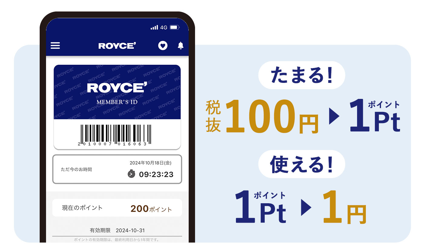 ロイズ直営店でお買い物をすると、税抜100円につき1ポイント付与いたします。ためたポイントは、お会計時に1ポイント=1円でご利用いただけます。すでにポイントカードをお持ちの方は、カードのポイントをアプリに引き継いでご利用いただけます。