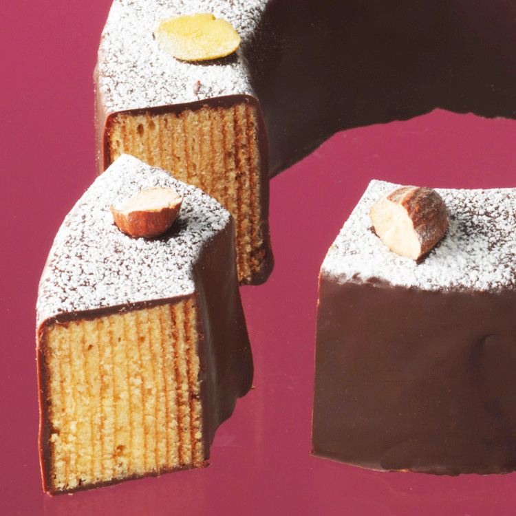 クリスマスリースをイメージして、粉糖と3種のナッツをあしらったミニサイズのバウムクーヘン。はちみつやスパイス、メープルシロップ、マジパンローマッセを生地に加え、しっとりとしたコクのある味わいに仕上げました。生地の豊かな味わいを、コーティングしたすっきりとした甘さのチョコレートが引き立てます。