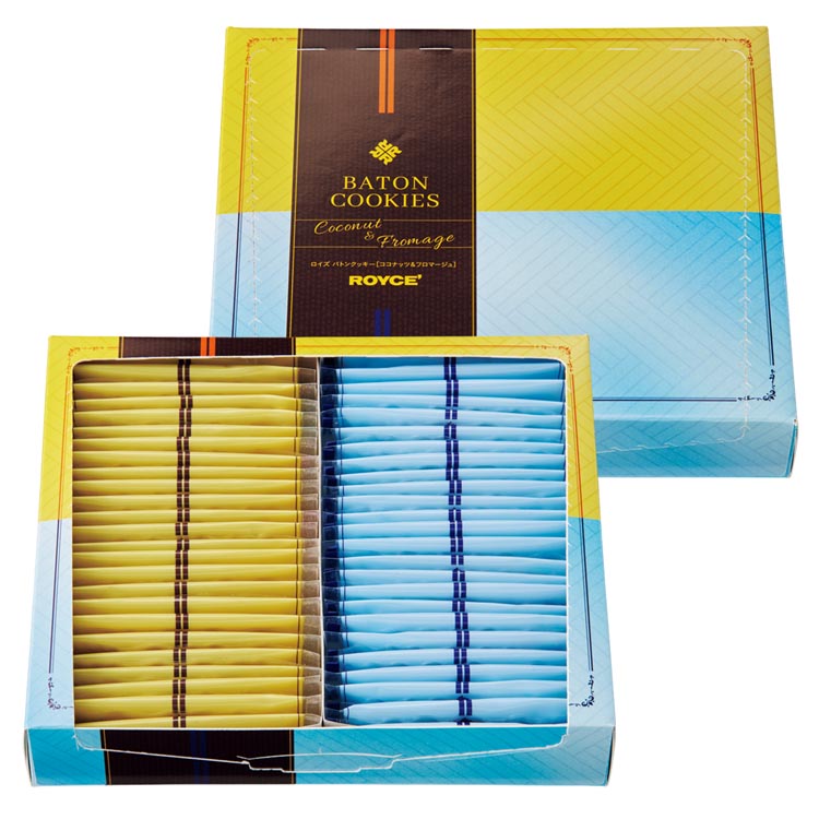 さくさく軽やかな食感のバトンクッキー。ローストしたココナッツの香ばしさがたまらない[ココナッツ]と、2種類の北海道産チーズの塩味とホワイトチョコレートが口の中でとけ合う[フロマージュ]。2つのおいしさを一度にお楽しみいただける詰め合わせです。