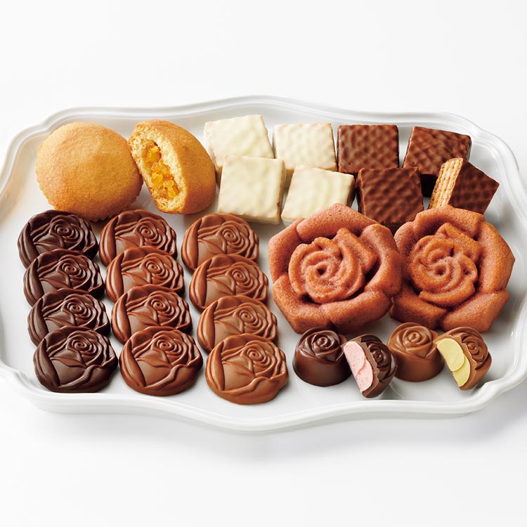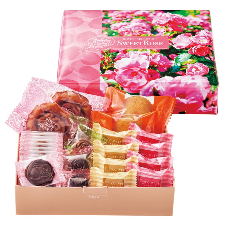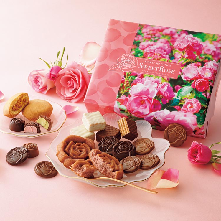 バラの花の形をしたフィナンシェやチョコレートをはじめ、目にもうれしく、華やかなカラーの個包装のお菓子をひと箱に集めた“スイーツの花束”。美しいバラが咲き誇る「ロイズ ローズ ガーデン」の写真を使用した包装紙も、母の日の贈り物にぴったりです。
