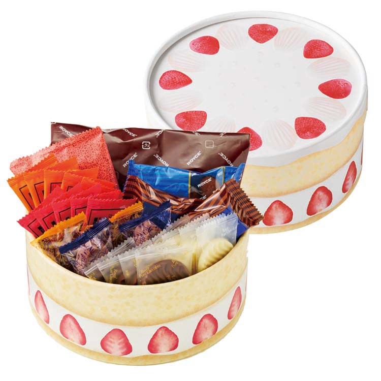 このロイズのデコレーションケーキはまさにお菓子の宝庫!いちごケーキ型のボックスには、豊富なチョコレートとクッキーが詰まっています。大小のボックスを購入し、二つを重ねるとまるで本物のいちごケーキのように楽しい仕掛けがあります。
